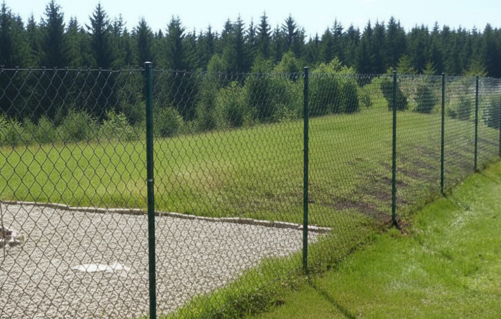 La pose d’une clôture simple torsion consiste à dévider et à tendre un grillage à mailles losanges sur des fils de tension préalablement fixés à des poteaux scellés.
